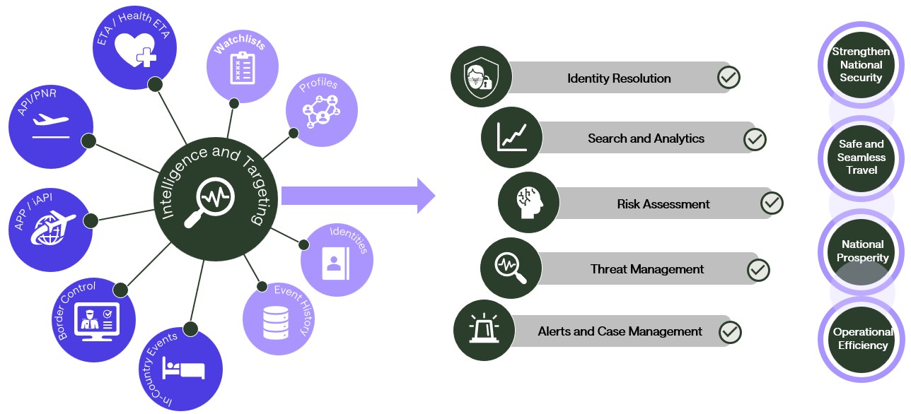 Whether it’s identifying persons of interest or ‘persona non grata’, using API data, or driving down risk via an Integrated Border Management Solution. Acquire, enrich and integrate data from multiple sources across the travel journey and enable collaboration of agencies for successful interventions.
